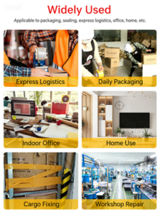 Widely used in express packaging, pallet wrapping, box sealing, household goods, office supplies, industrial fixing, electronic assembly, automotive manufacturing, and architectural decoration.